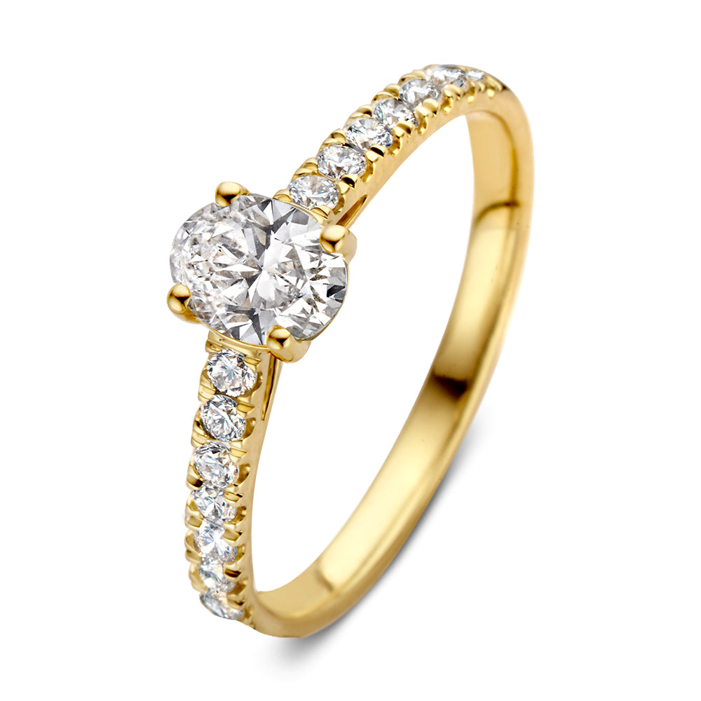 Ontdek de speelse en elegante ring Franky. Dankzij de ovaal geslepen diamant heeft deze solitair ring een opvallende uitstraling. Ovale diamanten schitteren optimaal en ogen bovendien groter. De diamanten in de band van de ring, maken deze royal versie extra vrolijk. Kies zelf de gewenste steengrootte van jouw diamant. De stijlvolle Franky ring is in verschillende maten en goudkleuren beschikbaar.