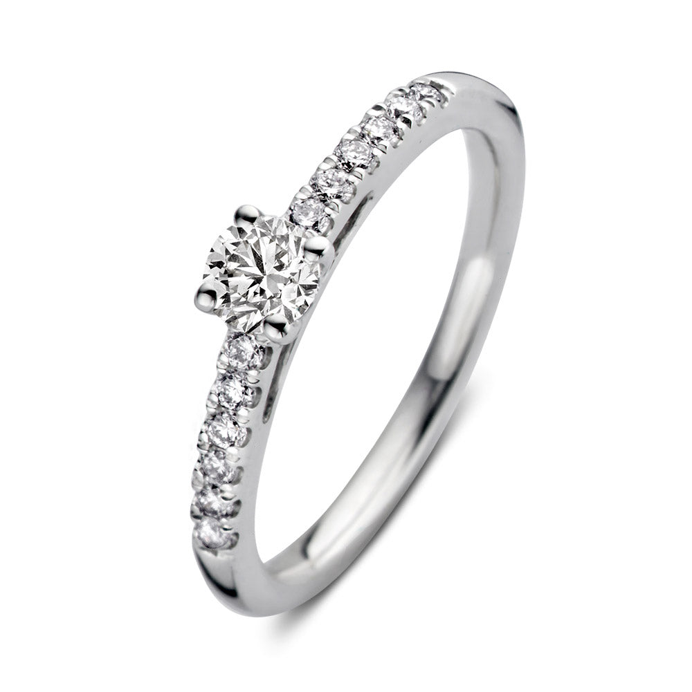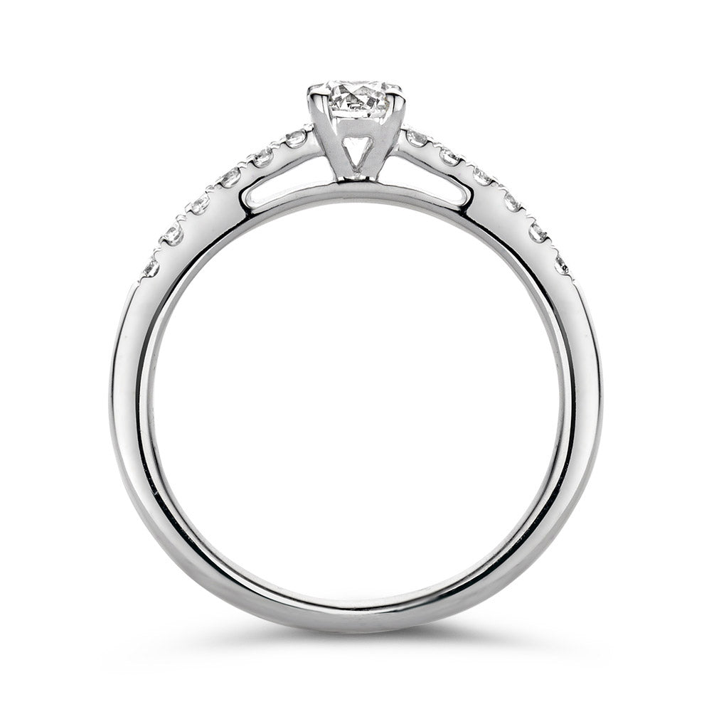 Ring Mary is een absoluut plaatje om te zien. Deze moderne klassieker bevat een prachtige briljant in vierpootszetting omgeven door fijnere briljanten in de scheen. Dankzij de open zetting vangt de diamant veel licht en schittert hij optimaal. Mary is prachtig te combineren met een gladde of diamanten rijring. Probeer haar voor extra sparkle bijvoorbeeld eens samen met ring Millie.