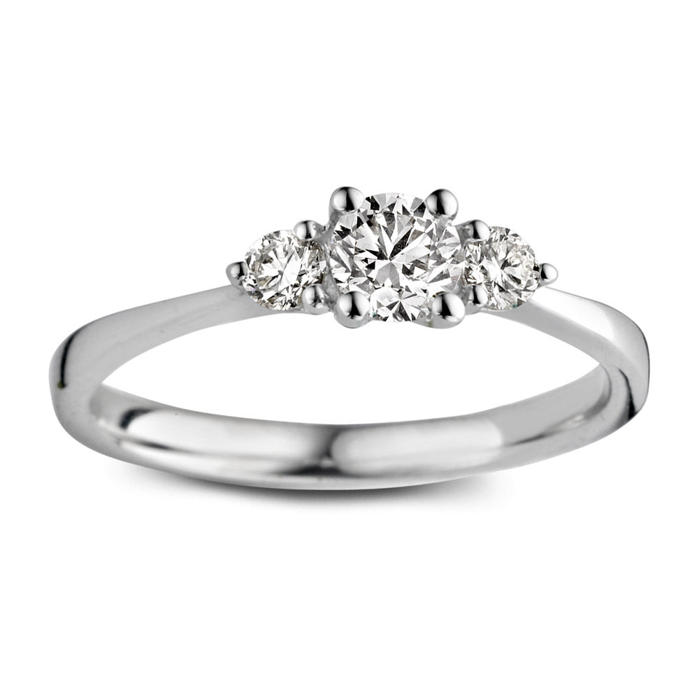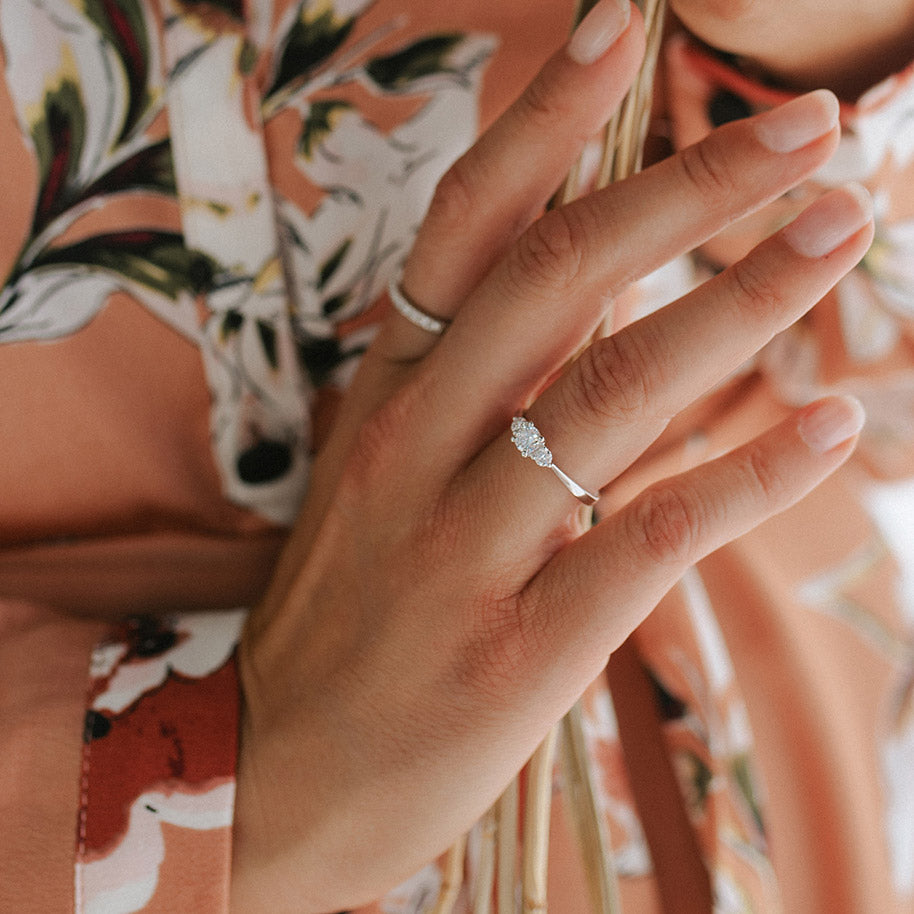 Alix is onze schitterende driesteensring! Zoals de naam al verklapt bevat de ring drie diamanten, waarbij de twee zijstenen de grote middensteen extra laten stralen. Bij een driesteensring staan de drie stenen symbool voor het verleden, heden en de toekomst. Het is daarom een perfecte ring voor speciale gelegenheden als bijvoorbeeld een verloving! We hebben Alix bovendien zo ontworpen dat er een aanschuif- of trouwring tegenaan gedragen kan worden. Wat dacht je bijvoorbeeld van onze Millie ring?