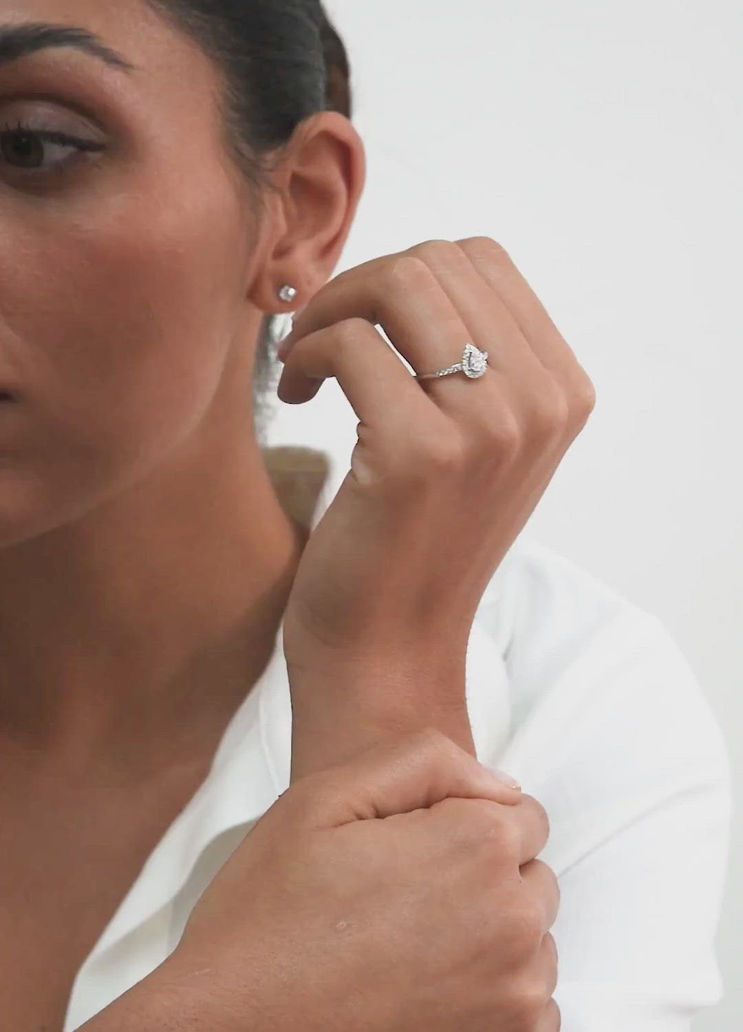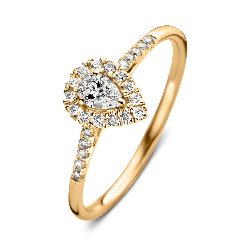 Een echte eyecatcher binnen de collectie is deze peervormige Elin ring! De fancy cut diamant is geslepen in peervorm en valt dan ook onmiddellijk op. De middensteen is bovendien omringd door kleinere briljant geslepen diamant voor een extra wauw-factor. Ook de scheen van de ring bevat fijne, fonkelende diamanten, wat de luxe uitstraling helemaal compleet maakt. De ring heeft een sierlijke verhoogde zetting, waardoor hij perfect gecombineerd kan worden met een gladde of diamanten rijring. Wat dacht je bijvoorbeeld van onze Millie ring?