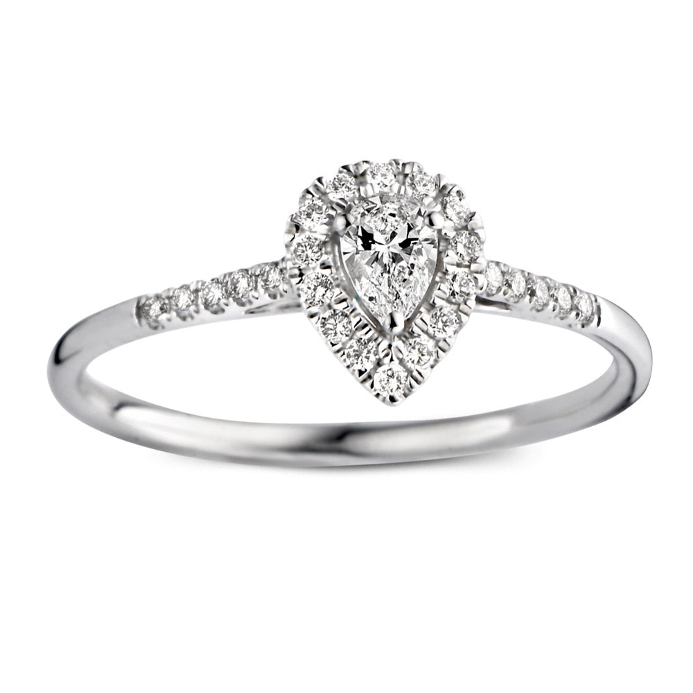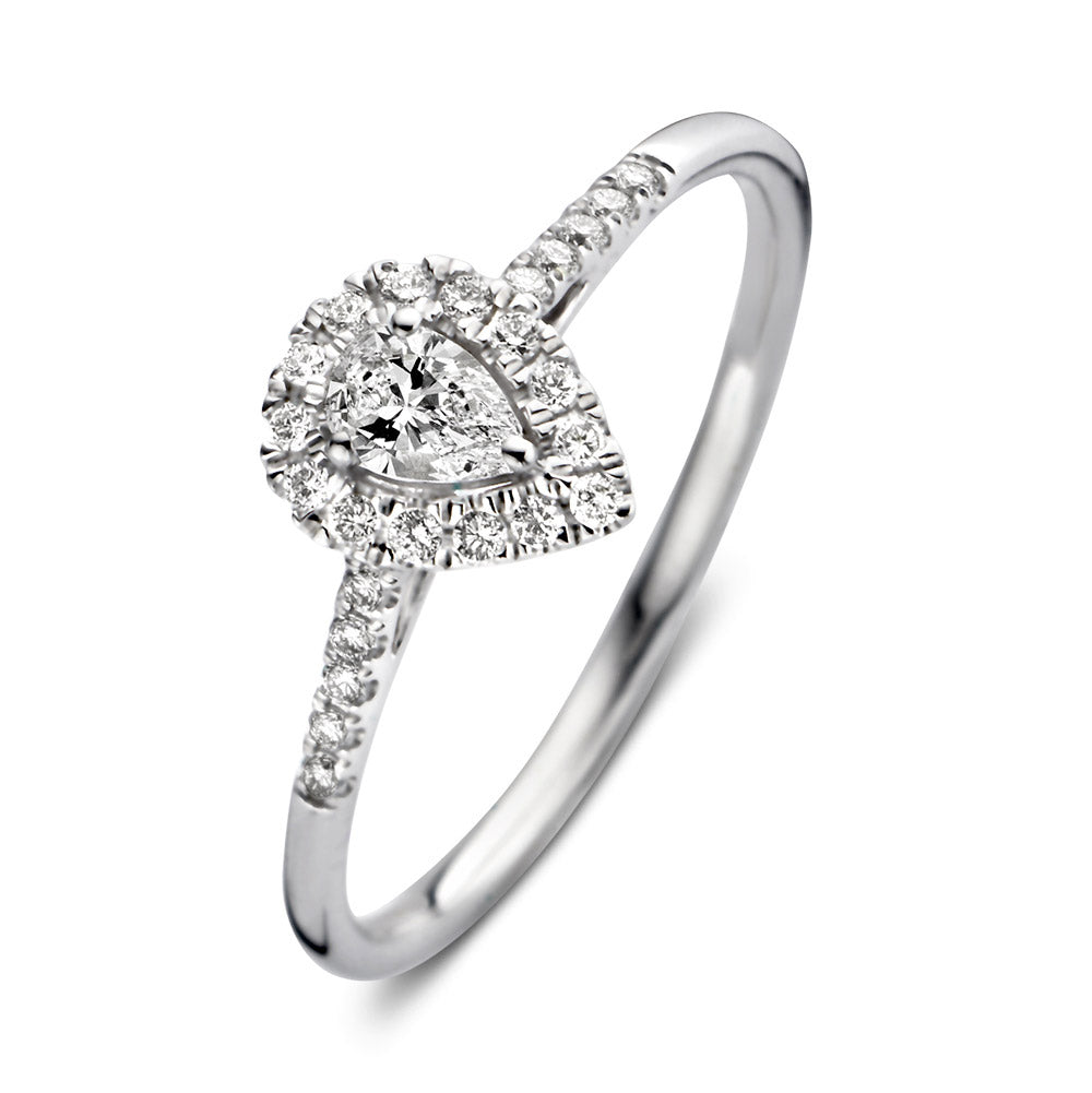 Een echte eyecatcher binnen de collectie is deze peervormige Elin ring! De fancy cut diamant is geslepen in peervorm en valt dan ook onmiddellijk op. De middensteen is bovendien omringd door kleinere briljant geslepen diamant voor een extra wauw-factor. Ook de scheen van de ring bevat fijne, fonkelende diamanten, wat de luxe uitstraling helemaal compleet maakt. De ring heeft een sierlijke verhoogde zetting, waardoor hij perfect gecombineerd kan worden met een gladde of diamanten rijring. Wat dacht je bijvoorbeeld van onze Millie ring?
