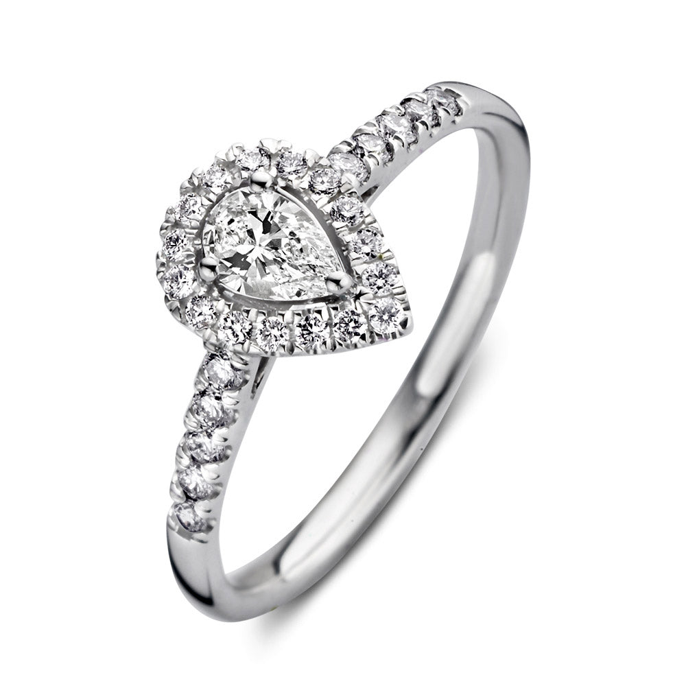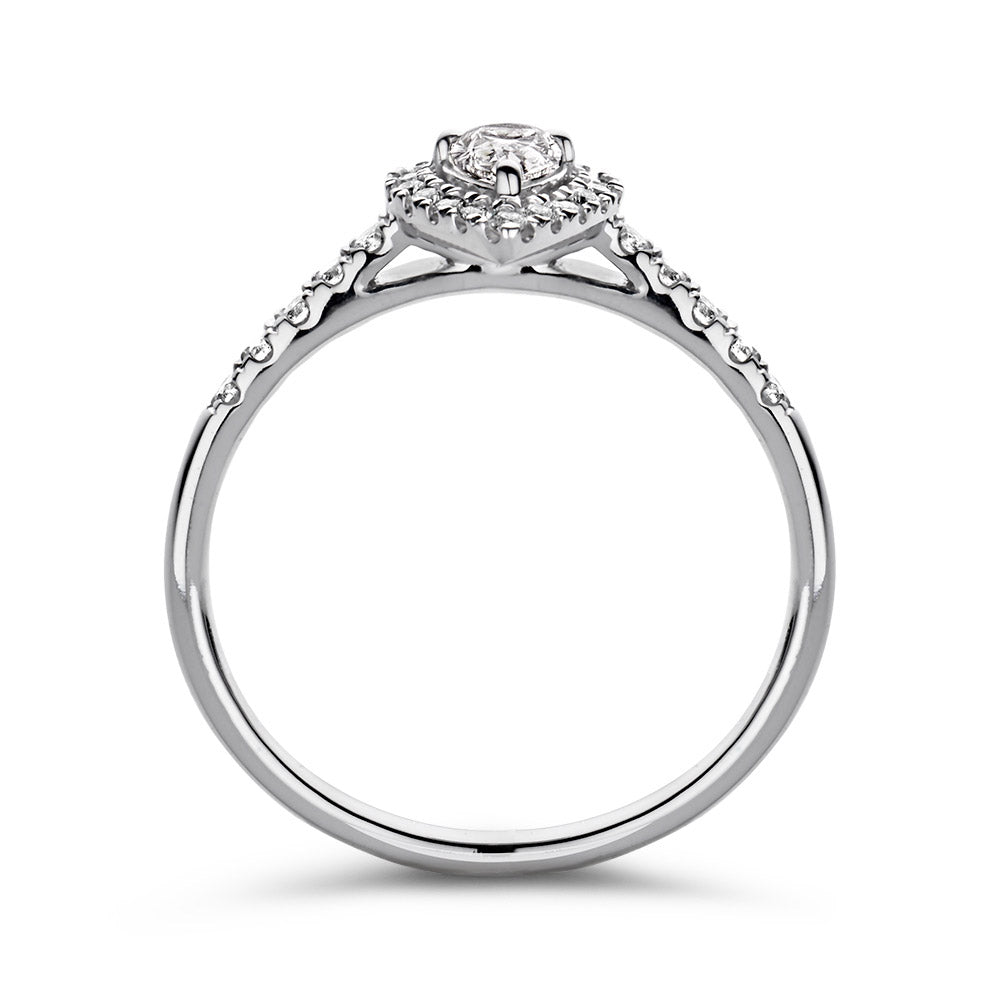 Een echte eyecatcher binnen de collectie is deze peervormige Elin ring! De fancy cut diamant is geslepen in peervorm en valt dan ook onmiddellijk op. De middensteen is bovendien omringd door kleinere briljant geslepen diamant voor een extra wauw-factor. Ook de scheen van de ring bevat fijne, fonkelende diamanten, wat de luxe uitstraling helemaal compleet maakt. De ring heeft een sierlijke verhoogde zetting, waardoor hij perfect gecombineerd kan worden met een gladde of diamanten rijring. Wat dacht je bijvoorbeeld van onze Millie ring?