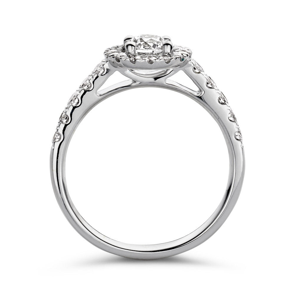 Dankzij haar stijlvolle en luxe uitstraling is ring Emma één van onze meest populaire ringmodellen. De ring heeft een schitterende entourage zetting. De ronde middensteen (briljant geslepen) wordt hierbij omringd door kleinere briljanten. De zijstenen in de scheen maken het plaatje van deze luxe ring compleet! De ring heeft een sierlijke verhoogde zetting, waardoor hij perfect gecombineerd kan worden met een gladde of diamanten rijring. Combineer haar bijvoorbeeld met de verfijnde Millie ring.