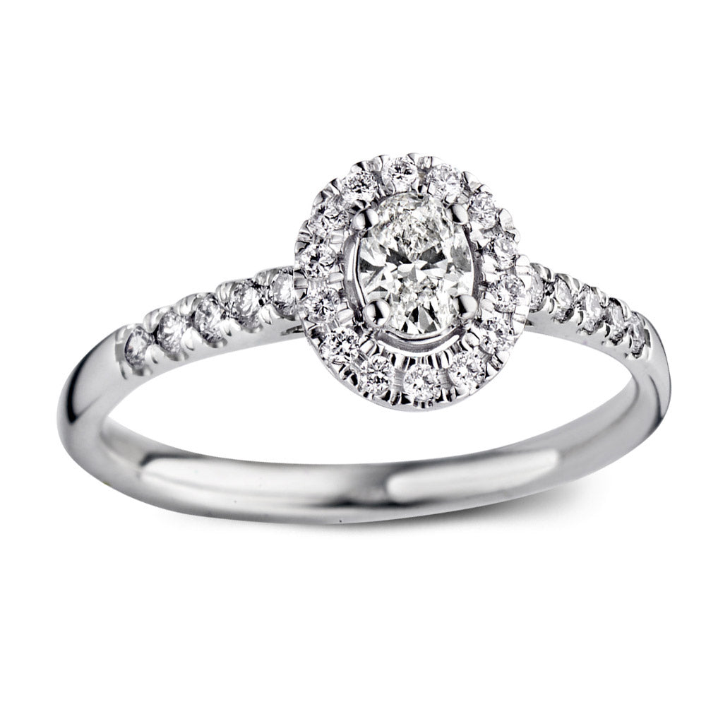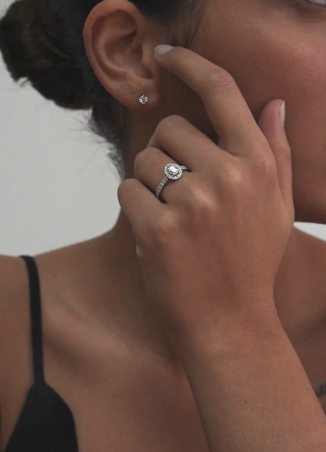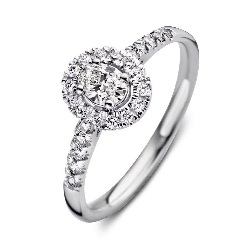 Rosie is een klassieker in een modern jasje. Deze ring bevat als stralend middenpunt een prachtige ovaal geslepen diamant. Rondom de ovale middensteen zijn kleinere briljanten gezet. De extra briljanten in de scheen van de ring maken en fonkelende plaatje compleet! Dankzij de verhoogde zetting is ring Rosie perfect met andere gladde of diamanten rijringen te combineren. Probeer haar eens met onze aanschuifring Millie.