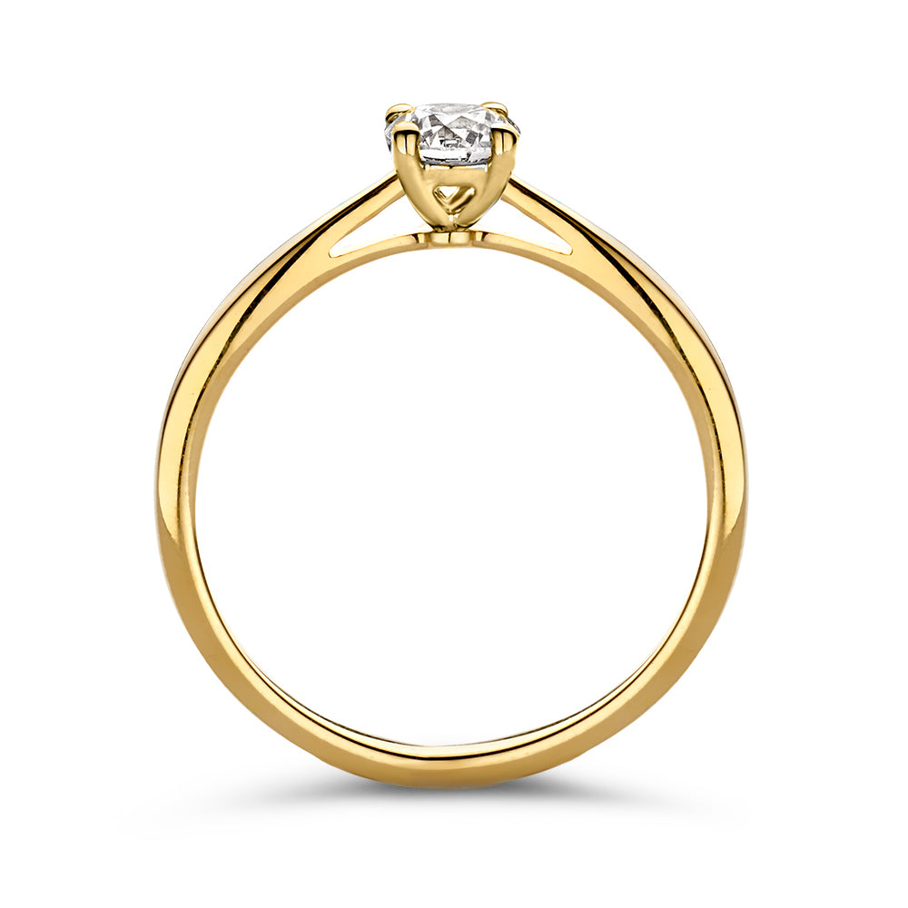 De natuurlijke kleur van het edelmetaal en in Nederland nog altijd de meest gevraagde goudkleur. Om het materiaal sterker te maken en een warme uitstraling te geven bevat de legering naast goud een kleine hoeveelheid zilver en koper. Diamantzettingen worden bij geelgouden sieraden vaak gemaakt van witgoud, hierdoor zullen de diamanten helderder schitteren. Uiteraard is het ook mogelijk om een ring helemaal in geelgoud te maken.