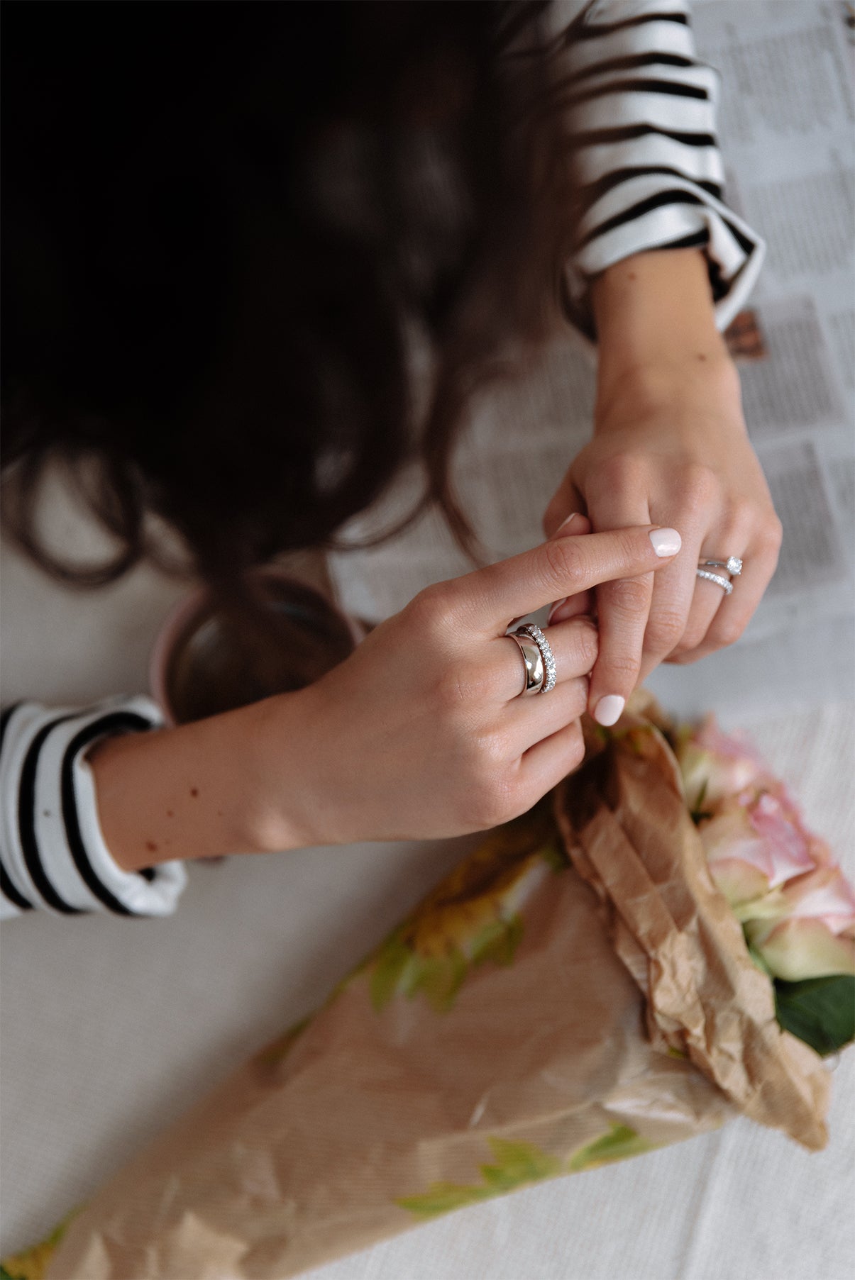 We hebben ze zo ontworpen dat ze perfect bij elkaar passen (qua kleur, aansluiting, montures) dus ook prachtig tegen je verlovingsring aan te dragen.