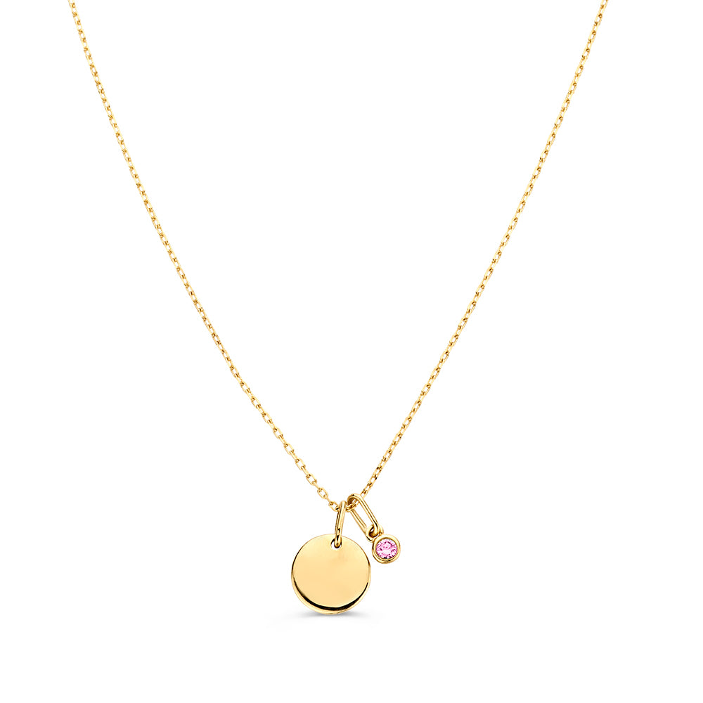 Collier met graveerplaatje + roze diamant hanger 0,05 crt. geelgoud
